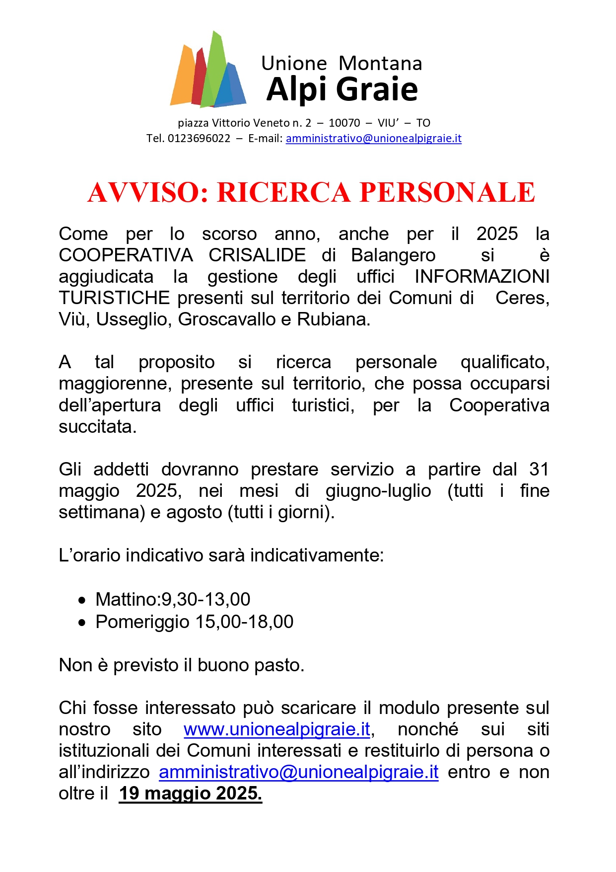Avviso: Ricerca personale punti informazione turistica Unione Montana Alpi Graie
